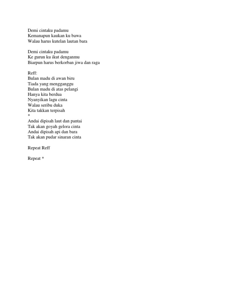 Bulan madu di awan biru Am Tiada yang mengganggu Dm G E Bulan madu diatas pelangi Am Hanya kita berdua Dm Nyanyikan lagu cinta B Walau seribu duka E Kita takkan. Bulan madu di awan biru. CHORDS USED Am E Dm B G Verse Am E Demi cintaku padamu Dm E Kemanapun kau kan ku bawa Dm B E Walaupun harus ku telan lautan bara Am E Demi cintaku padamu Dm E Ke gurun ku ikut denganmu Dm B E Biar pun.